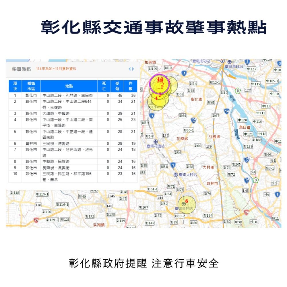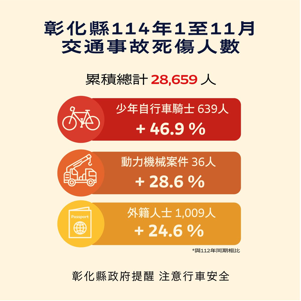 根據交通部道安資訊查詢網,本縣114年1-11月道路交通事故與112年同期比較分析,以少年自行車騎士(含電自、電輔) 事故增加46.9%最高,動力機械案件增加28.6%次之,外籍人士事故增加24.6%再次之。1-11月份鄉鎮市30日死亡人數於「彰化市、員林市、鹿港鎮」為多,肇事熱點以「彰化市」為多,合先敘明。 |