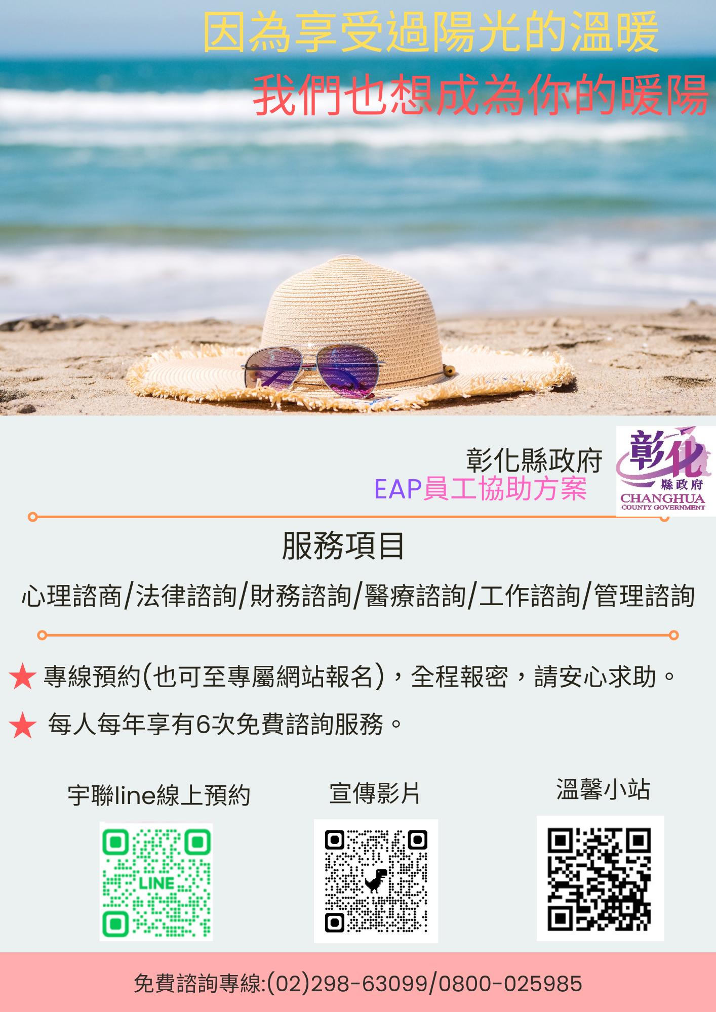 | 一、 | 本府115年委託專業機構宇聯管理顧問有限公司,提供心理、醫療、財務、法律、工作及組織管理等六大面向專業諮詢服務。同仁如有使用需求可撥打EAP專線(02-29863099、0800-025985) 、透過溫馨小站(https://sites.google.com/view/changhuaeap)預約或由本府人事處EAP窗口協助(04-7531412)。 |