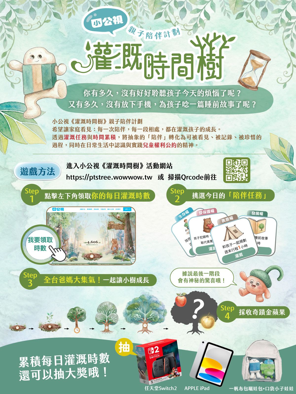 轉知:【小公視】「灌溉時間樹」線上親子活動,陪伴灌溉就有機會抽Switch2、iPad等多項好禮,請查照並鼓勵踴躍參與。